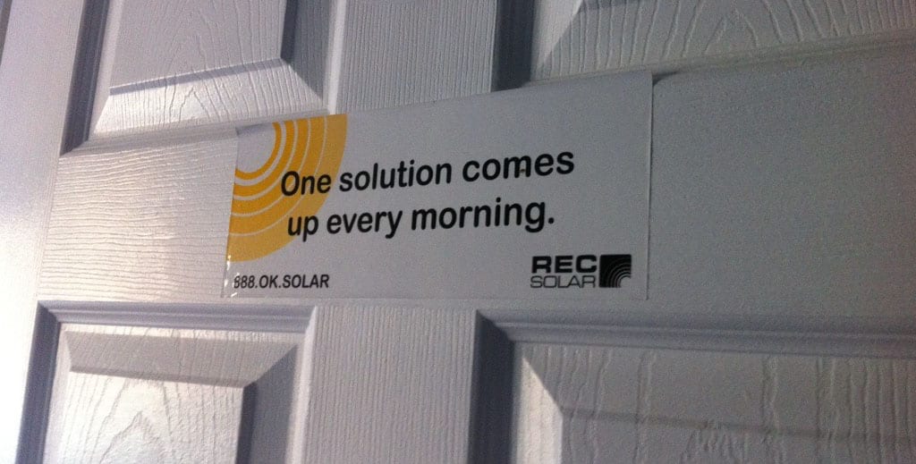 He even brought home an REC Solar bumper sticker from one of those meetings and placed it on his door.